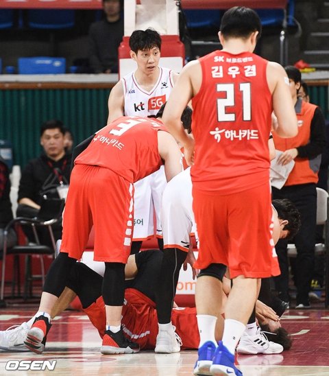 KT 포워드 한희원은 1쿼터 종료 4분여를 남기고 수비 리바운드를 잡았다. 그 상황에서 SK 포워드 김건우는 가로채기를 시도하다 파울을 범했다. 그런데 한희원은 상대의 접촉에 불편함을 드러내면서 왼쪽 팔꿈치를 높게 휘둘렀다. 김건우는 한희원의 팔꿈치에 맞고 쓰러졌다.