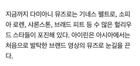 아이린 말고 역대 다미아니 뮤즈로는 기네스 펠트로, 샤론 스톤, 브래드 피트등의 헐리우드 스타들 ㄷㄷ