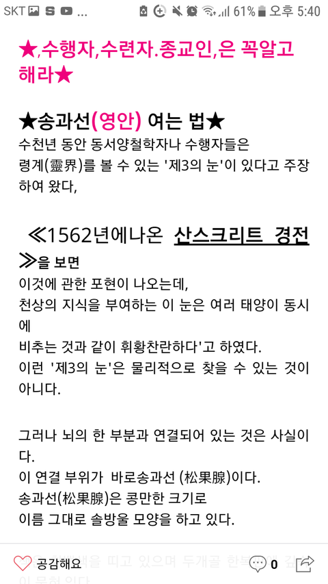 "이제 제 3의 눈이라고 사람의 뇌 중심부에 송과선이라고 있어요. 그 부위가 열리면 이제 제 3의 눈을 뜨게 되는데.."