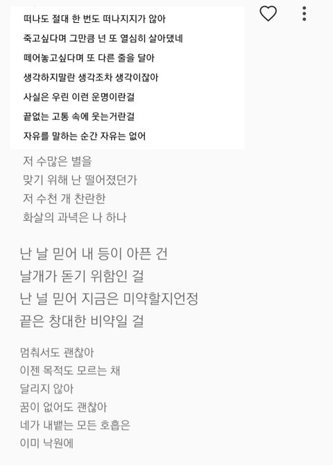 난 데뷔전부터 일았는데 요즘 다시 데뷔 초랑 데뷔전에 나왔던 노래들 듣고있거든 크리스마스 노래 연습생 버전이랑 아이돌 버전두개있는거 오랜만에 듣는데 아이돌 버전 호비부분 가사 진짜 듣다가 울뻔 '내 평생 여자친구 아미와 그리고 묵묵히 닦을래 노력이란 다이아' 라는 가사인데 그냥 갑자기 아미를 정말 아껴주는게 너무 확오기도 했고 진짜 노력해서 여기까지 왔구나 라는게 와닿아서ㅠ