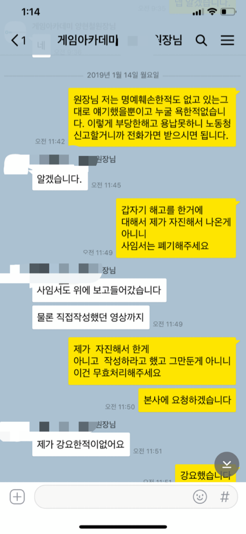 강요로 사직서를 작성했으니 폐기해달라는 카톡입니다.