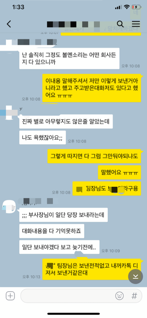 부사장이 말해준 제가 갑자기 짤린이유는 저와주고받은 톡을 같은 팀장으로 있는 직원이 보냈는데 거기 내용이 욕한것도 없고 그저 한달도 안되 다른지역에서 원장으로 승진해서 부임한 원장의 일적인 한탄내용이였습니다. 누구나 이정도 한탄은 동료들끼리 할수 있지 않나 싶습니다. 상대동료도 그정도는 할수 있다고 자기도 욕했는데 ,,, 이렇게 얘기를 했습니다.