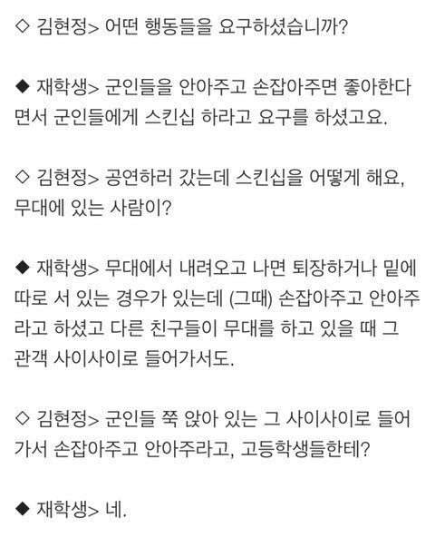 나 이거보고 놀람 술자리 공연에 학생들 동원? 진짜 미친거 아니야??? 군인한테 스킨쉽하라 시킨것부터 술자리... 학생들이 ㅊㄴ로 보였어?진짜 미쳤냐고