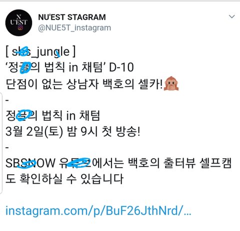 - jub글의 법칙 in 채텀 3월 2일(토) 밤 9시 첫 방송! - SB에스 NOW you튜브에서는 백호의 출터뷰 셀프캠도 확인하실 수 있습니다 (link: https://www.instagram.com/p/BuF26JthNrd/?utm_source=ig_share_sheet&igshid=1508ekked3nil) instagram.com/p/BuF26JthNrd/…