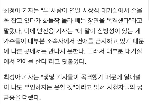 기자 왈 “후배 기자가 직접 목격한건데 보이그룹 걸그룹이 대기실 옆방이였다. 화장실앞에 그 걸그룹 멤버가 서있었는데 보이그룹 멤버가 손깍지를 끼고 화들짝 놀라 빼버렸다. 그 멤버 아주 상남자다”