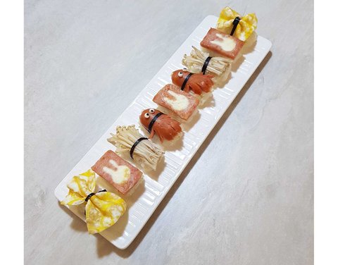 계란, 스팸, 좋아하는 팽이버섯, 소세지를 이용해 키즈초밥을 만들어줬어요.