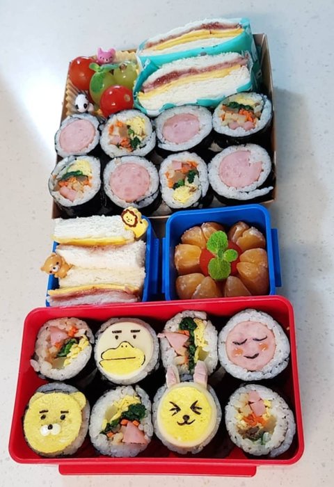 검정색은 대부분김이에요. 노란치즈는 체다치즈였나.. 슬라이스 치즈중에 노란색과 하얀색나는색이 있는데 늘 두가지 같이사고, 빨간색은 파프리카를 주로 많이 쓰고 당근 등등 많이 사용해요