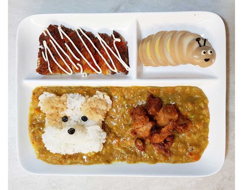 밥으로 강아지를 만들고 카레베이스에 치킨, 그리고 계란장조림으로 애벌레를 만들어줬구요.