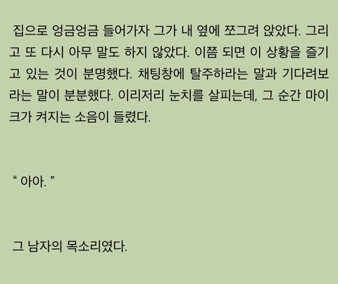 이건 둘의 첫 만남ㅋㅋㅋㅋㅋ배틀운동장 겜 하면서 공 캐릭만 졸졸 쫓아다니는 수,,내용은 거의 이런식으로 전개되고 수 시점이다보니 방송채팅창, 자음, 팬반응 이런게 많이 나와! 근데 작가님이 워낙에 센스가 좋으셔서 난 개재밌게 봄ㅋㅋㅋㅋㅋㅋ약간 커뮤 많이 뛰어보신 말솜씨임