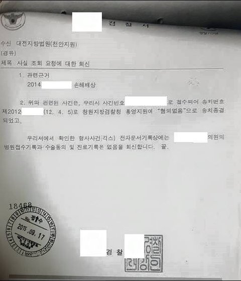 - 녹취록에 담당의사의 전화통화에서 사실이 들어났음에도 증거의 조작은 계속되었고, 보건소에서는 신고사실이 없다고 주장했지만 보건소에서 병원을 방문하여 조사하였다는 회신을 보냄으로 저의 신고가 있엇다는 사실이 확인이 되었습니다.