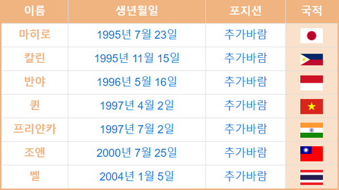 걸그룹은 순서대로 일본, 필리핀, 인도네시아, 베트남, 인도, 대만, 태국인(일본인 멤버는 일본 걸그룹 노기자카46 출신), 보이그룹은 아직 프로필이 공개되지 않은 듯