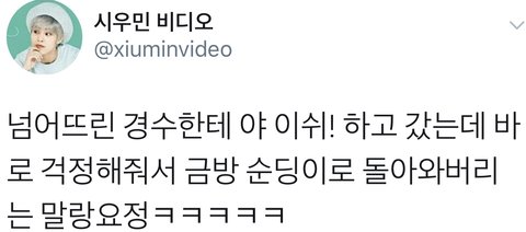 시우민 동생한테 부딪쳐서 한방에 KO되고 너 죽어써~~하고 갔는데 경수가 너무 다정하게 괜찮아? 해서 급 순둥이모드로 다시 돌아온거 너무 귀엽고 웃기다고ㅠㅠㅠ