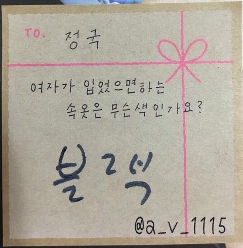 7. 마지막으로 저게 주작인걸 팬들이 먼저 밝힐게 아니라 저게 진짜 정국이가 썼다는 증거부터 가져와야지?? 조카 힘들게 남돌 팬싸까지 가서 원하는 여자 속옷색깔 질문하는게 과연 제정신 박힌 년일까??? ㅋㅋㅋㅋㅋㅋㅋ
