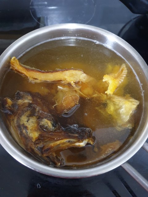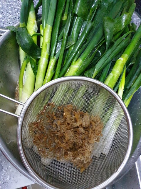 제사떄 사용한 북어포를 팔팔끓여주고 건데기는 우리집애완 견 가을이의 영양식으로 주었어요. 국물에 다른젓갈을 넣어 끓인다음 식혀주고 그물망에 걸려 파머리부분에 담가줍니다....머리부분과 잎부분의 간이 골고루 베게하기위함입니다.