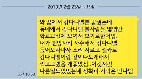 사진은 내가 꿈꿀때마다 카톡 나에게보내기로 꿈내용 적는데 그내용임꿈에서 강다니엘이 일일 선생님? 멘토? 이런걸로 나와서 이야기 들려주고수영장 놀러가서 놀고그랬는데 개좋았음ㅋㅋ분명 관심없었는데 설레네