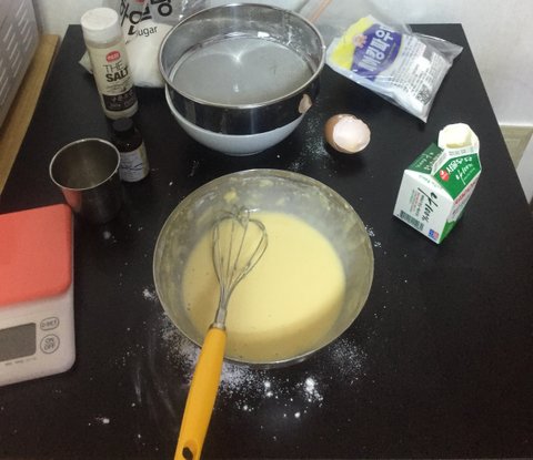 박력분 다썼으니 중력분100g+우유100ml+설탕 35g+베이킹파우더 3g+소금 한꼬집+계란 한개+바닐라 익스트랙 약간=개판