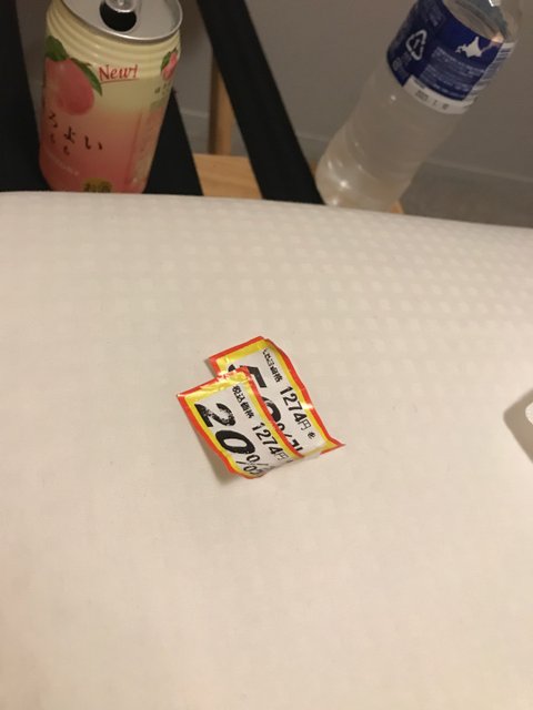 마트에서 사시미 50%세일 하는 것과 음료수 사와서 호텔 새하얀 침대이불위에서 인증샷을 찍고있었습니다.