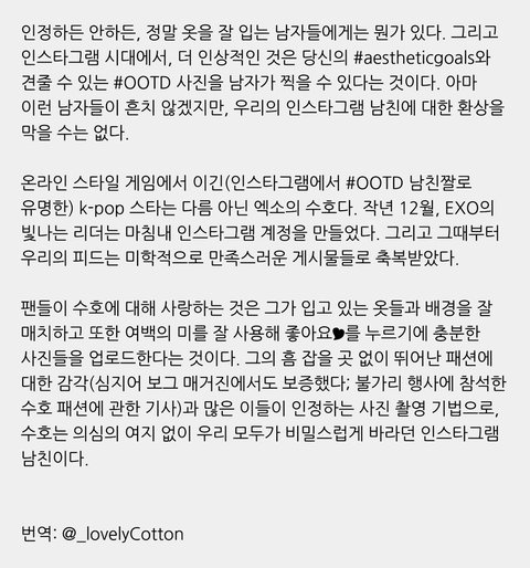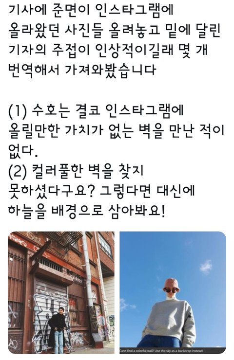 외국 기사고 준면이 인별 사진 보면서 자기 의견을 써놓은거임 외국 기자도 인정하는 준면이 패션 센수!!!