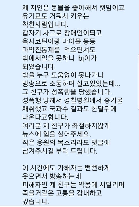 피해자는 제 친구이고 솔직히 정말 짜증나네요 영지라는 비제이가가해자입니다 여러분들이 도와주셔야 제 친구가 살것같아요 매처는 팝콘티비이구요 청와대 청원게시판에도 팝콘비제이성폭행사건 으로 썻습니다 꼭 동의해주세요 ^^♡^^
