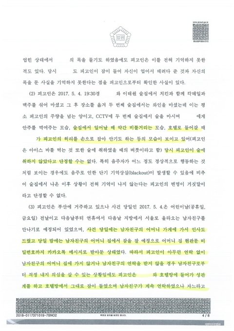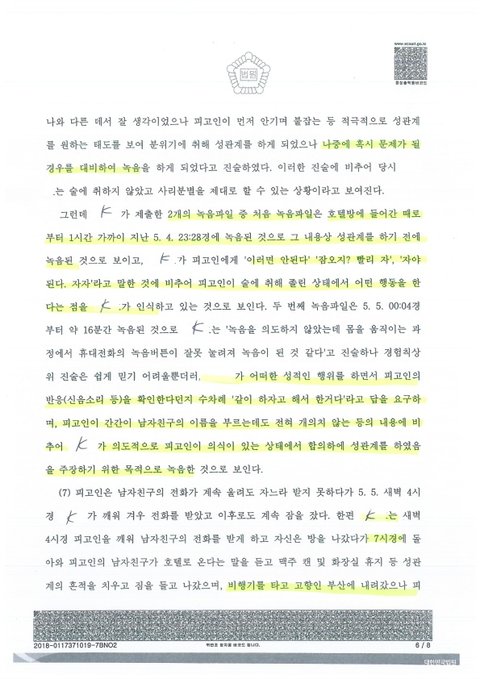여자친구는 2017. 5. 4. 직장 상사이자 회사 본사 노동조합 국장이었던 K씨와 이태원에서 저녁을 먹고, 2017. 5. 5. 새벽 술에 만취한 후 K씨가 미리 예약해둔 호텔 안에서 강간을 당했습니다.