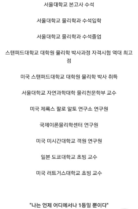 그럼뭐해.... 업적이 없는데. 아인슈타인은 맨날 낙제에 그리스어 라틴어과목은 늘 0점에 가까웠고 오로지 수학하나 잘하는 괴짜였는데 학교도 겨우겨우 졸업. 그런데 아인슈타인은 누구나 다 아는데 저분을 폄하하려는게 아니라 과학계에 무슨 업적? 이게 본말이 전도된 케이스. 과학자는 시험을 잘보는게 아니라 연구 업적으로 인류공영에 이바지하는게 목적임