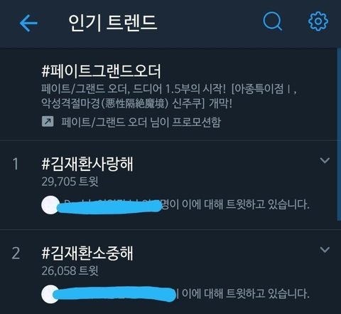 우리 윈드들 총공 독려도 없이 김재환 사랑해, 김재환 소중해 나란히 1,2위 한 거 너무 감동이야 ㅠ