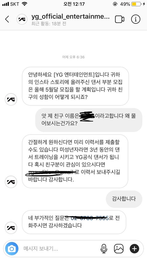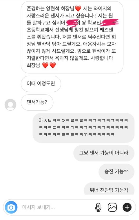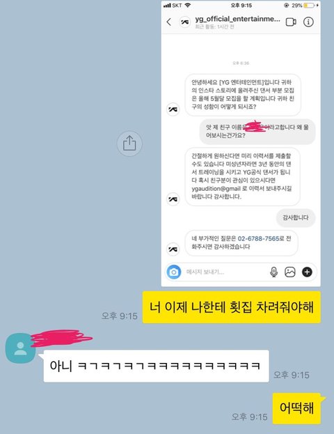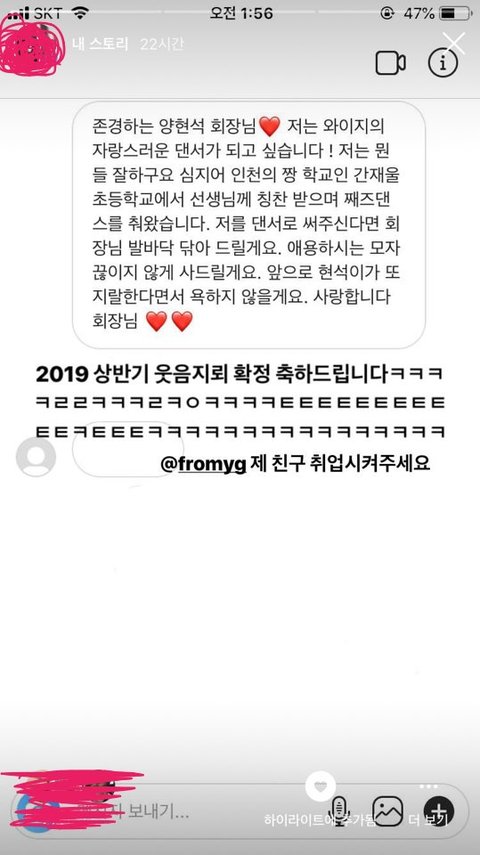 내가 인스타 스토리에 올림 그냥 생각하다보니 내가 그냥 재미로 와이지 엔터계정을 만들고 진짜 취업시켜준다고 하면 웃기겠다고 생각함