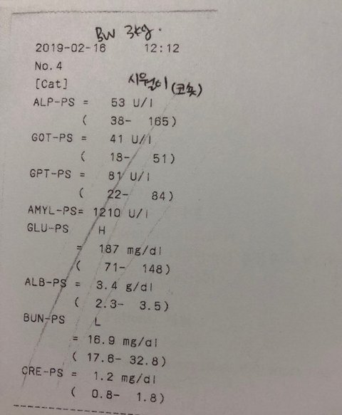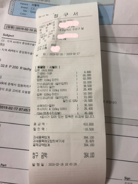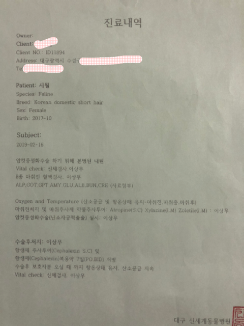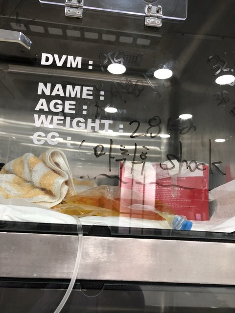 첫번째 몸무게 재지않았다는점 (이건 퇴원하기전에 간호사에게 몇키로냐고 물어보니 마취가 덜 깬 아이를 케이지 인에서 다시 꺼내려고 한걸보아 안쟀다고 생각했고 그리고 2차병원에서 진료내역 가지고 다시 갔을때 병원기록에 몸무게가 빠져 있었어요 몸무게는 쟀지만 기록은 안했답니다)