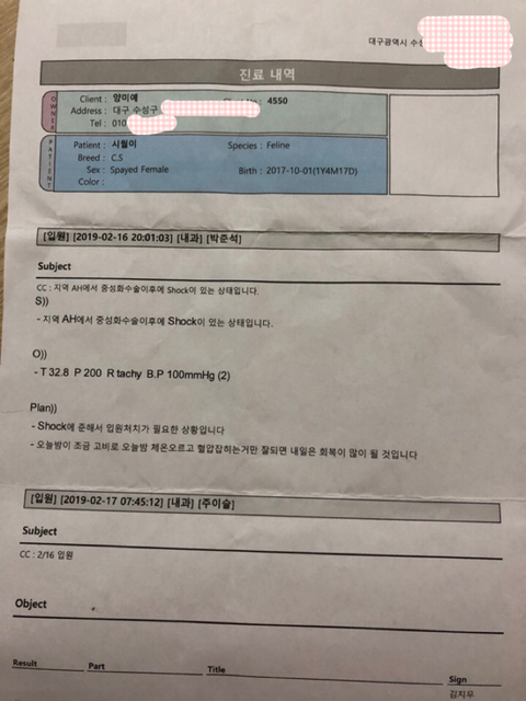 2019/02/16일 대구 수성구 ㅅx x 동물 병원에서 저희 집 첫째 시월이가 중성화 수술을 했고요~ 수술 과정에서 문제가 발생했습니다