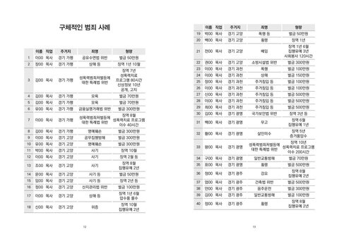 범죄 명목도 사기, 주거침입, 성범죄, 상해, 명예훼손, 폭행, 횡령, 교통사고, 문서위조, 업무방해