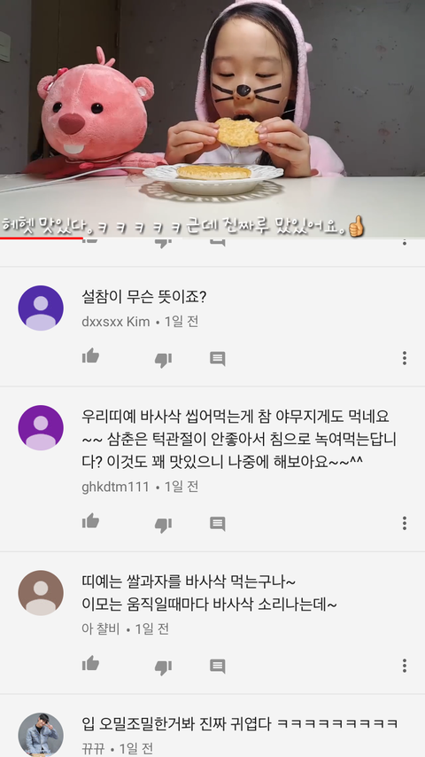‘띠예는 ~네요 ㅎㅎ 삼촌/이모는 나이먹어서 ~인데’ 등등 이런류의 댓글... 처음엔 재밌었는데 갈수록 재밌지도 않고 어린애한테 왜자꾸 신세한탄을 하는지 모르겠음 ㅋㅋ 오죽하면 애가 자기가 의사가 되어 고쳐주겠다하겠냐... 1절만해야 재밌지 맨날 댓글에서 노화타령을 하고있어..... 재미도없고 그냥 보기 불편함.. 어린애한테 왜 자기 불행을 얘기하는거임