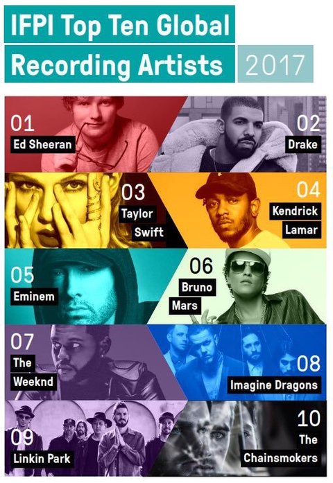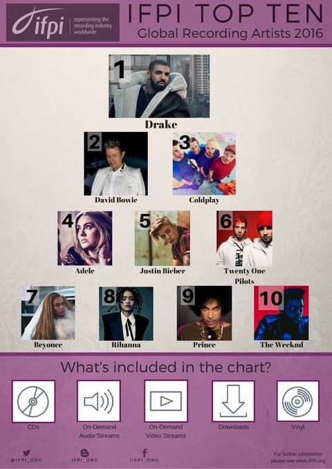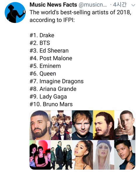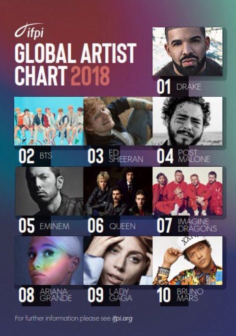 IFPI에서는 매년 전세계 실물 음반 + 음원 다운로드 스트리밍 등을 모두 포함하여 그 해에 아티스트가 발표한 모든 음반 음원 통합 판매량 기준으로 순위를 매겨서 올해의 아티스트를 선정하는데 방탄소년단이 드레이크 다음으로 2위를 차지함.