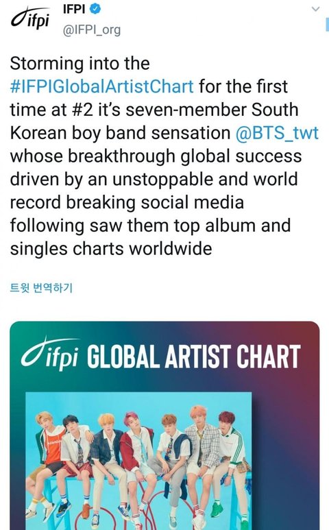 이 IFPI 차트에서 방탄소년단이 2위를 차지함.