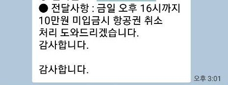 '미 입금시 항공권 취소처리 도와드리겠습니다' 라고 문자가 왔다.