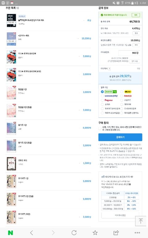 44500원이상 카트에 담고 일반도서쿠폰 4만원이상 담으면 만원할인해주는 쿠폰이랑 화요일마다 주는 뉴레쿠폰10%까지 적용하고