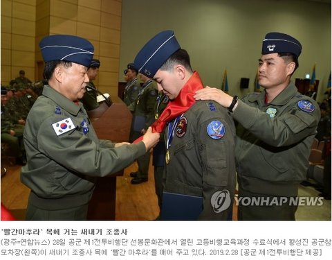 (사진 설명) (광주=연합뉴스) 28일 공군 제1전투비행단 선봉문화관에서 열린 고등비행교육과정 수료식에서 황성진 공군참모차장(왼쪽)이 새내기 조종사 목에 '빨간 마후라'를 매어 주고 있다. 2019.2.28 <공군 제1전투비행단 제공>