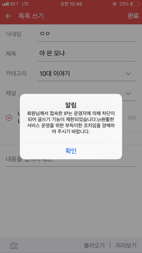 나 추천템 글 쓰려구 했는데 관리자가 내 IP 차단했다고 글 못 올린대 데이터로도 해봤는데 안돼 개빡치네 시부럴 것들