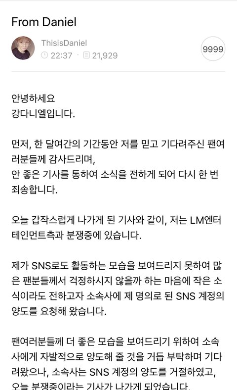 지금 강다니엘이 공카에 직접 쓴 편지 떴음 로그인 안 해도 다 볼 수 있다고해서 그냥 올릴게