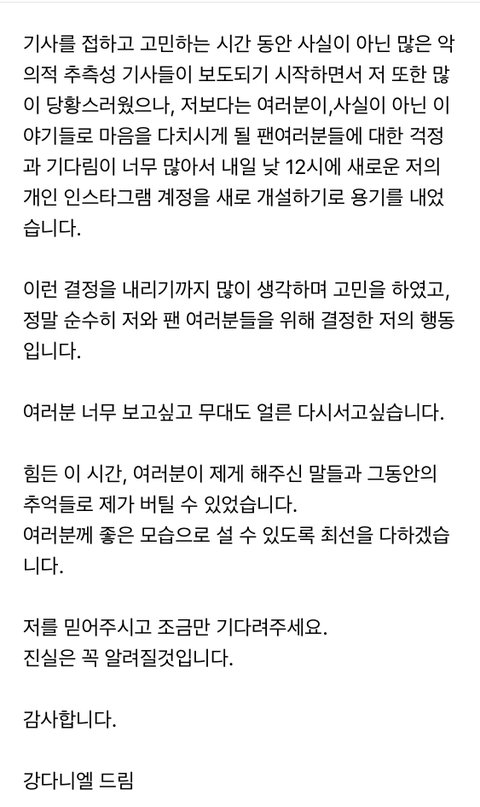 근데 이거만 봐도 지금 뜨는 추측성 기사들 다 구라란거 알 수 있다. 다니엘은 그저 한 달 동안 지치는 팬들을 위해서 인별만이라도 주라는 거였는데 심지어 자기 명의로 만든 거 ㅋㅋㅋ그거 하나 못주고 지금 더럽게 언플하고 있지. 마지막 문장 보면 진짜 믿을 수 밖에 없다. 진실은 알려질거래. 다니엘은 절대로 말 한마디 함부로 하지 않음. 특히 글로 전할 때는 더욱. 그러니까 몰려온 애들아 괜히 나중에 고소장 받지 말고 루머 퍼뜨리지마