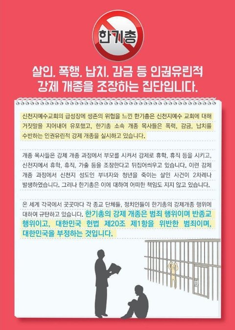 이는 한기총에서 이단으로 지목한 교단의 신도들을 대상으로 진행되고 있습니다.