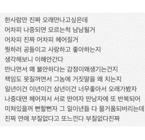 과정에서 즐거움을 찾아야 하는데 그걸 다 누린 후의 힘듦이 너무 커서 연애 시작하기가 무서워요 내가 헤어진지 얼마 안돼서 더 그런건가 아무튼 아직은 누굴 만날 준비가 안된듯