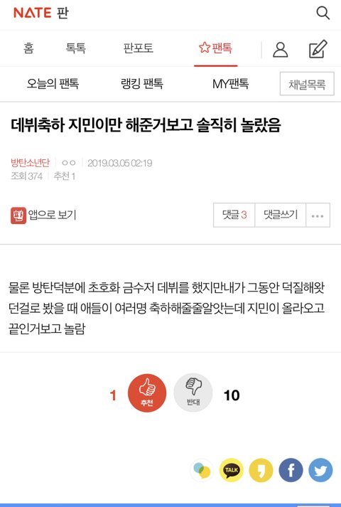 데뷔축하 지민이만 해준거보고 솔직히 놀랐음