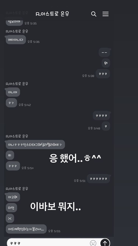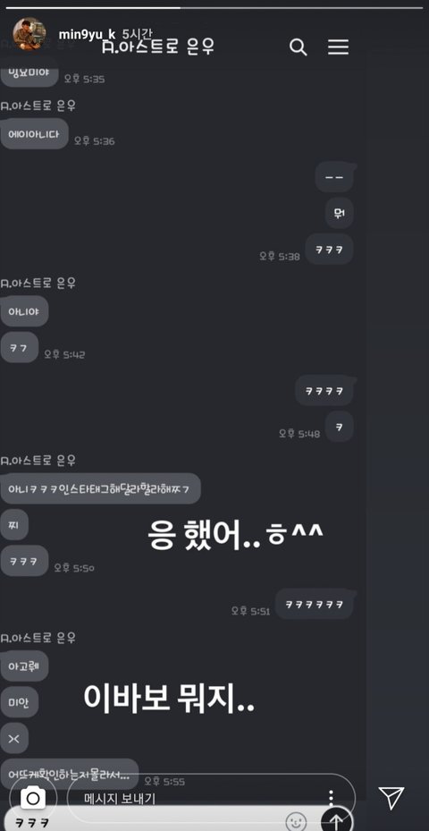이거는 민규 인스타 스토리! 차은우님과 민규 톡내용 ㅋㅋㅋㅋ 둘다 귀여워ㅠㅠㅠㅠ