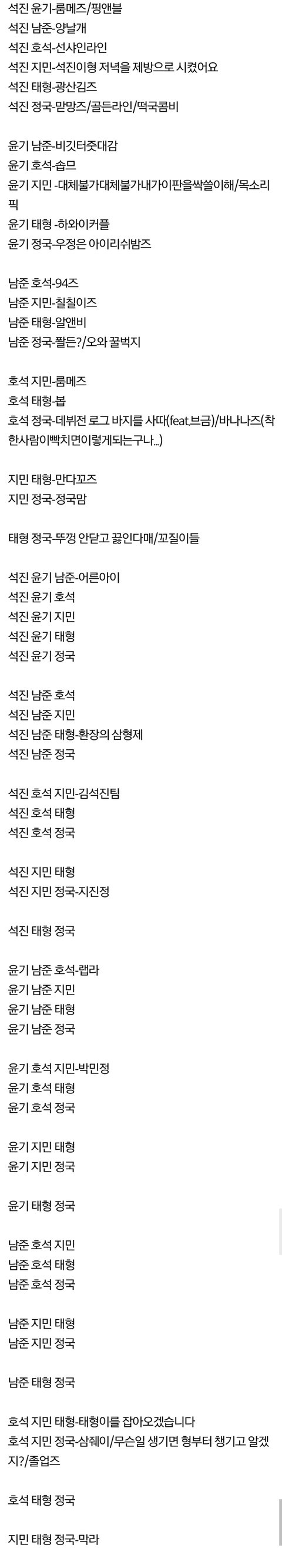 헉 반대실수야 미안해ㅠㅠㅠㅠㅠ)) 1.맏형라인(진 슈가 알엠 제이홉) 2.막내라인(지민 뷔 정국) 3.지진정(지민 진 정국) 4.만다꼬즈,구오즈(지민 뷔) 5.하와이커플(슈가 뷔) 6.랩라인(슈가 알엠 제이홉) 7.보컬라인(진 지민 뷔 정국) 8.구오준(알엠 지민 뷔) 9.구사즈(알엠 제이홉) 10.솝(므)(슈가 제이홉) 11.봅(제이홉 뷔) 12.김형제(진 알엠 뷔) // 일단 생각나는건 다 적었고 이 관계에 대해 알고싶으면 유.튜브에 저 라인 이름 치거나 방탄소년단 케미라고 서치하면 많이 볼 수 있을거양