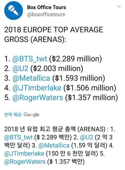 2018 유럽 아레나콘서트 평균 총액 1위