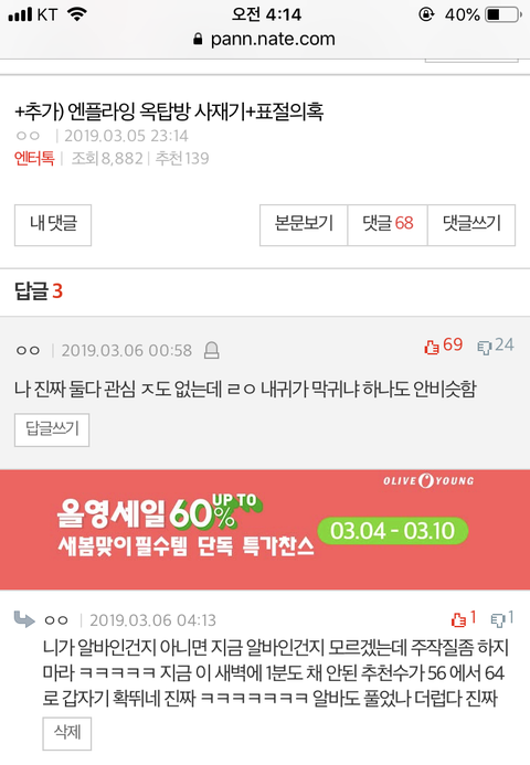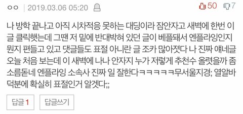어쩌다 엔플라잉한테 좀만 우호적인 댓글 썼더니 알바들이 몰려와서 추천 조작하고가고 ㅋㅋㅋㅋ