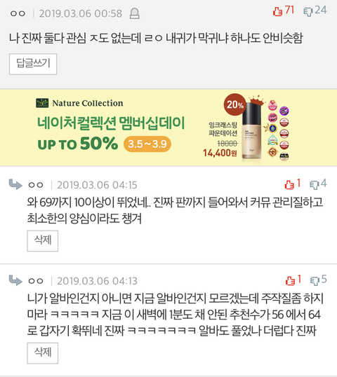 답글 읽어놓고선 비추만박고 튀고 계속 추천수조작하길래 그 와중에 계속 추천조작하냐, 판까지들어와서 커뮤 통제하냐고 답글 하나 더 달았더니 거기도 광속으로 비추 네댓개박힘.