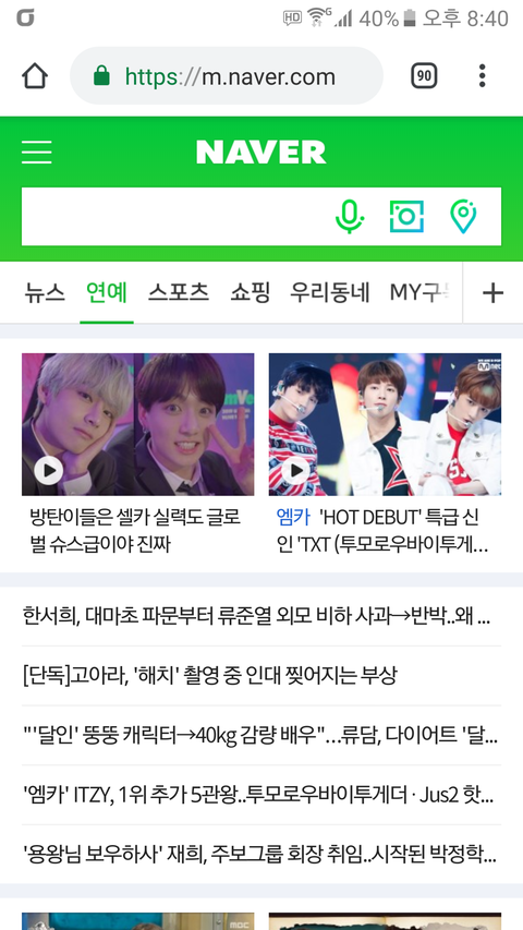 네이버 연예 메인란에있는 방탄 > TXT 미만잡