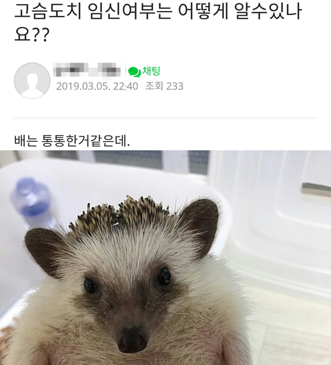 보통 고슴도치의 임신 증거로 암컷 가시로 인해서 수컷 배나 암컷 등에 피가 묻어있는 걸 찾는데, 이 사람은 피가 없다고 함. 본인이 가시를 죄다 잘라놔서 찔릴 가시가 없으니 피가 안났을 거라고 생각하니 지금도 열불이 터짐.