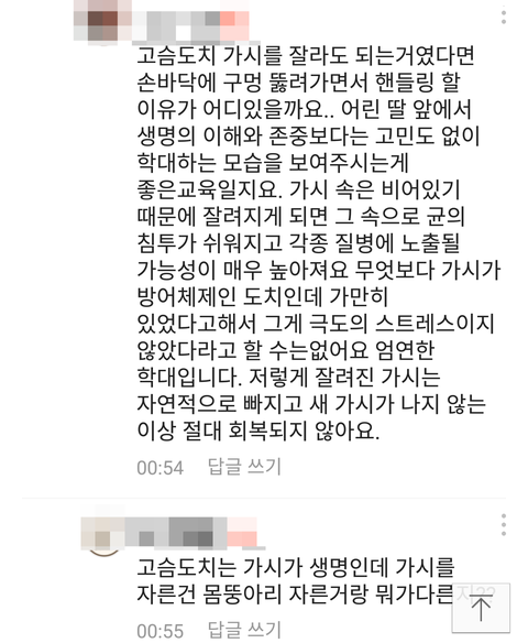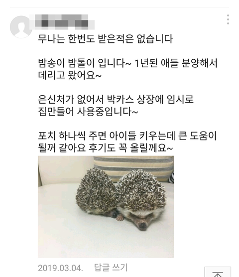 현재는 이 글도 삭제, 카페도 탈퇴한 상태. 걱정하는 사람들이 고슴도치 병원 데려가라, 영수증 인증해라 등 말이 많았으나 확인 답글도 없이 사라져버림. 나머지 새끼 고슴도치와 부모 고슴도치가 매우 걱정되는 상태임..